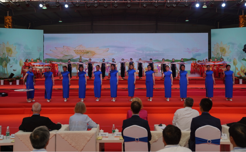 開幕式過后,與會領(lǐng)導(dǎo)和嘉賓共同觀看了“蘇北明珠·美麗黃海”文化活動展演。龍鼓、太極、功夫扇、旗袍秀組合表演《激情6月》、少兒足球操表演《我健康 我快樂》、古箏、古琴、茶藝、古典舞蹈表演《盛世琴韻》,示范園內(nèi)歡歌笑語、載歌載舞,見證了第五屆田間日的成功舉辦,用文化盛宴精彩展現(xiàn)了“蘇北明珠·美麗黃海”。