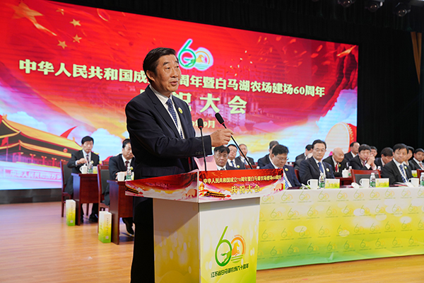 姚春華在致辭中代表農場公司黨委向60年來為白馬湖經濟社會發展作出貢獻的所有老領導、老知青、老職工,向所有為農場發展建設獻出寶貴生命的烈士親屬以及關心支持農場發展的社會各界人士致以崇高的敬意!向參加慶祝活動的集團公司領導,淮安區委、區政府、區人大、區政協領導,集團相關部室領導、區相關部委辦局領導、友鄰單位領導和墾區兄弟農場的領導,向參加慶祝活動的歷任老領導表示最熱烈的歡迎和衷心的感謝!