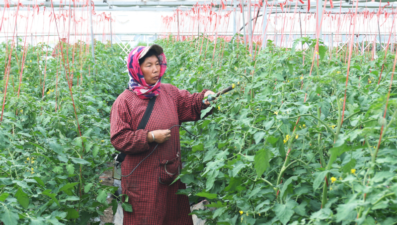 5月3日,興墾科技工作人員在大棚里進行作物管理。圖1,工作人員為新品番茄進行人工授粉,圖2,工作人員為貝貝南瓜進行搭蔓。