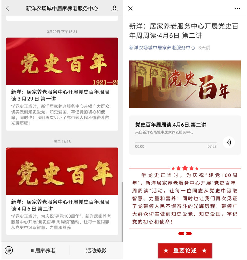 連日來,新洋農(nóng)場(chǎng)有限公司以多種形式開展黨史學(xué)習(xí)教育,強(qiáng)化黨員干部黨史學(xué)習(xí)教育參與度,確保黨史學(xué)習(xí)教育取得實(shí)效。其中居家養(yǎng)老服務(wù)中心利用中心微信公眾號(hào)開展的“黨史百年·周周讀”活動(dòng)讓職工群眾再次見證黨帶領(lǐng)人民不懈奮斗的光輝歷程,受到大家的一致好評(píng)。