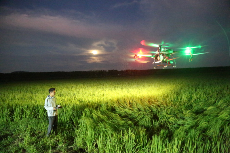 “這塊地是梯形的,等會這塊地飛完,要把地邊找一找,防止漏飛。”8月30日晚,在蘇墾農發崗埠分公司王溝生產區葛莊隊的一處田邊,大隊管理員葛高樹正和無人機飛手進行交流,叮囑操作注意事項。在田間,一架大型無人機閃爍著燈光,在飛手的操作下有條不紊地進行噴施作業,所到之處卷起陣陣白霧。眼下正是水稻產量形成的關鍵時期,也是病蟲害高發時期。連日來,崗埠分公司組織農業科、生產區農技人員和大隊管理員,著眼紋枯病、稻曲病、稻縱卷葉螟、稻飛虱等高發病蟲害,深入田間展開排查統計,分類施策,科學開展肥水管理和綠色防控,抓好4.5萬畝水稻的穗期管理工作。“無人機夜間對水稻進行病蟲害綜合防治作業,避開白天高溫作業風險,大大提升作業效率,一臺無人機每小時可噴灑150畝,有力加速防治進程。”崗埠分公司農業中心負責人表示,無人機飛防不僅作業效率快,防治效果好,減少農藥使用量,降低農業生產成本,且能大大降低勞動強度,一舉多得。當前正是穗期水稻病蟲害綜合防治關鍵節點,分公司共組織無人機40余臺,采取夜間操作,確保在規定防治時間內完成防治任務,為秋糧豐收打好基礎。近年來,崗埠分公司切實提升農業現代化水平,注重科技對農業發展的影