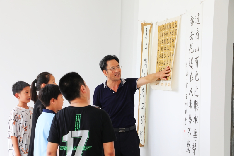 8月28日,在江心沙職工書屋二樓,一場為期一周,象征著收獲的青少年書法展,吸引了不少職工居民和學生前來觀覽。圖為“書迷”們觀摩“暑期公益課堂·書法班”“結業”作品的溫馨場景。