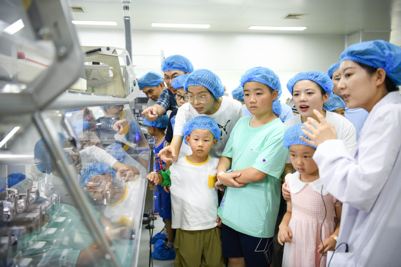 云港連夏荷,晴天正秋風。8月20日,正大天晴第二季“愛在天晴 家倍美好”家庭活動日在連云港廠區舉辦。開幕式上,人力資源中心總監代表公司向在企業發展中辛勤付出的天晴人及其背后的家人表示感謝,同時宣布自2024年起,正大天晴將增設“高考陪考假”,切實將公司的“六為文化”及“家文化”傳遞給每一位勤奮拼搏的天晴人。儀式上,公司代表為即將開啟大學生活的“晴二代”們送上升學祝賀、頒發獎學金。伴隨著熱烈的掌聲和飛向天際的氣球,第二季家庭日活動在歡聲笑語中正式開啟。在研究院,小朋友們在研發人員的指導下,小心翼翼地將白色乳糖粉末填充到膠囊殼中。往常見到都要躲著走的膠囊,這一刻卻成了愛不釋手的小寶貝。在精心準備的化學小試驗中,生活中常見的醋、雪碧,都有自己專屬的“酸堿色”。玻璃瓶中的五顏六色激起了孩子們的好奇心和求知欲,也在他們心中播下了一顆探索的種子。在生產車間,小朋友們隔著護欄近距離地觀看正在作業的機械臂,伸展、抓取、轉身、放置……機械手臂行云流水般的動作讓他們發出陣陣驚嘆。在大型生產設備前,孩子們全神貫注地聽著講解。現代化藥物生產車間在小朋友眼里像極了鎧甲勇士的基地,置身其中,像是一腳踏進了特攝片的